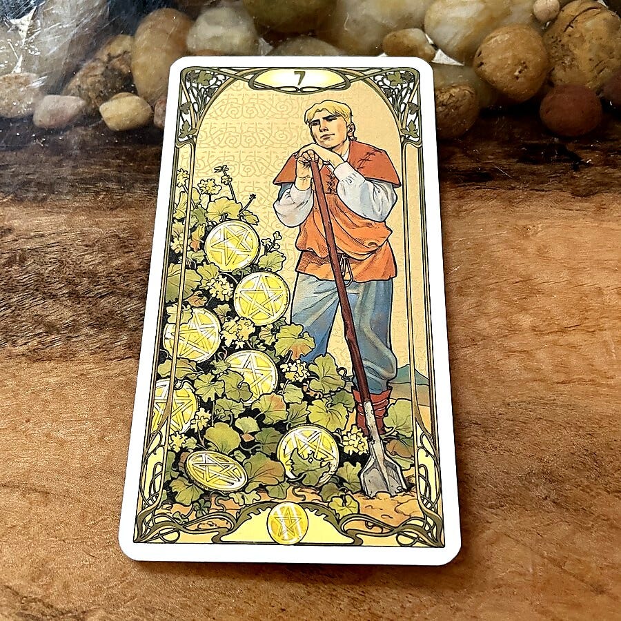 The 7 of Pentacles emerges at a time when reflection upon your journey is crucial. As you gaze upon this card, visualize the ripe, heavy fruits dangling just within reach, yet note the gardener's pensive gaze. The lush vine stands as a testament to the sustained effort already expended; it symbolizes the labor of tending to the minutiae, the daily grind that accumulates into something tangible.
